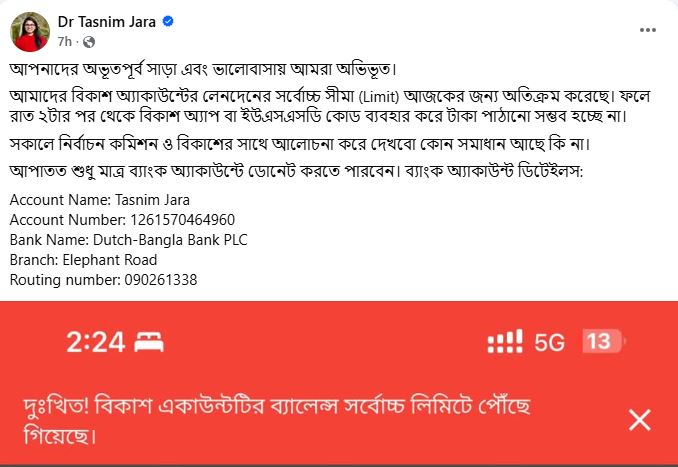 বর্তমানে রাত ২টার পর নির্ধারিত লিমিট অতিক্রম করার কারণে বিকাশের মাধ্যমে অনুদান পাঠানো সাময়িকভাবে সম্ভব হচ্ছে না। তবে ব্যাংক অ্যাকাউন্টের মাধ্যমে ডোনেশন গ্রহণ অব্যাহত রয়েছে