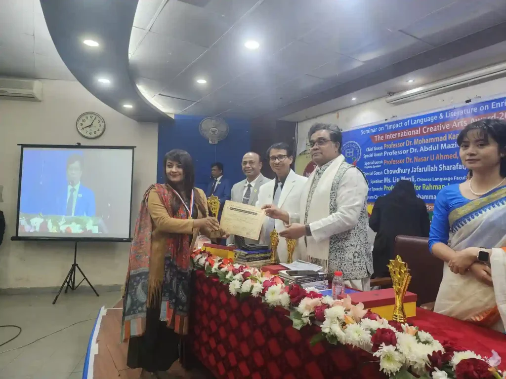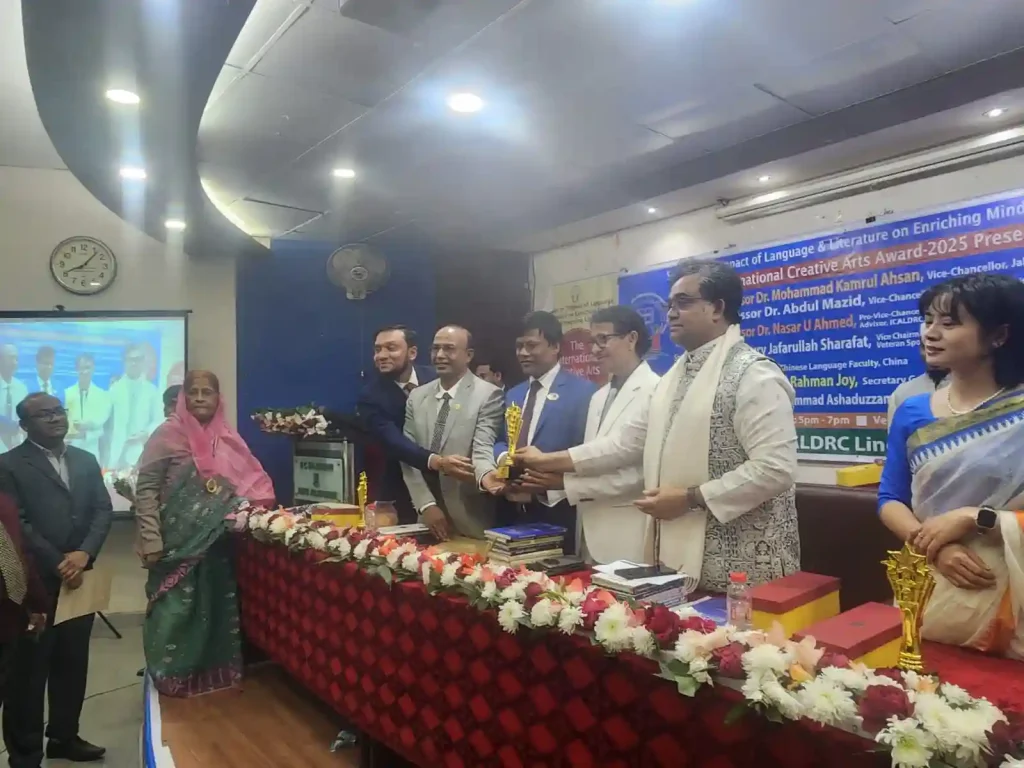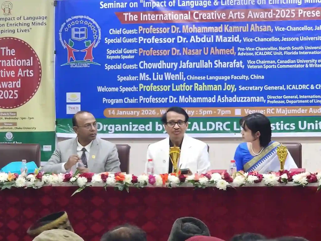 ঢাকা, ১৪ জানুয়ারি ২০২৬: সাহিত্য, ভাষা এবং সৃজনশীলতার চর্চাকে উৎসাহিত করতে ঢাকা বিশ্ববিদ্যালয়ে আজ অনুষ্ঠিত হয়ে গেল এক জাঁকজমকপূর্ণ আয়োজন। ICALDRC Linguistics Unit of Dhaka University-এর উদ্যোগে আয়োজিত এই অনুষ্ঠানে একই সাথে অনুষ্ঠিত হয় একটি জ্ঞানগর্ভ সেমিনার এবং ‘দ্য ইন্টারন্যাশনাল ক্রিয়েটিভ আর্টস অ্যাওয়ার্ড-২০২৫’ প্রদান অনুষ্ঠান।